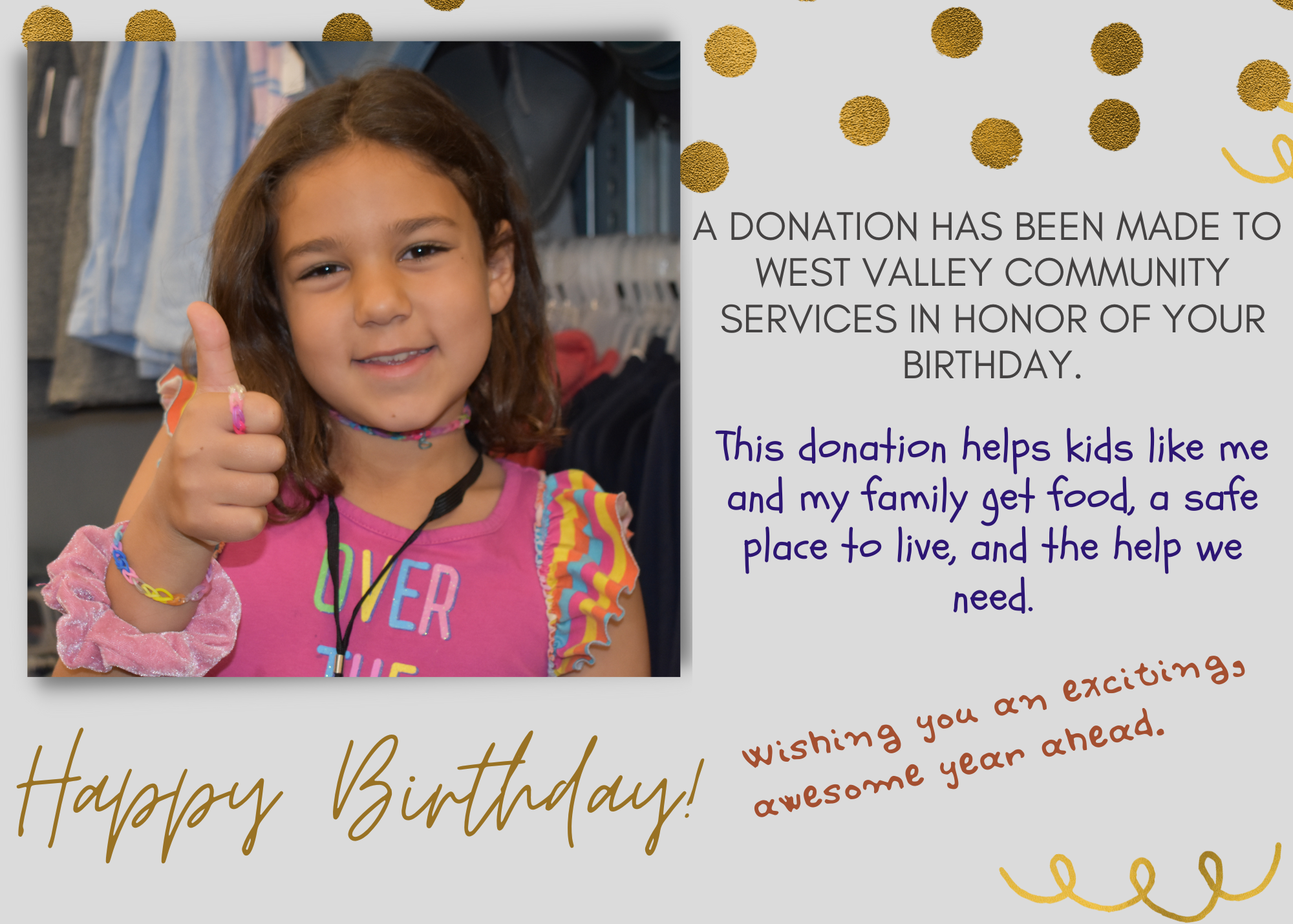 When a gift is made in honor of your birthday or a loved one's, West Valley Community Services can send a beautiful e-card with a thoughtful message to let the honoree know. Here is a sample of the